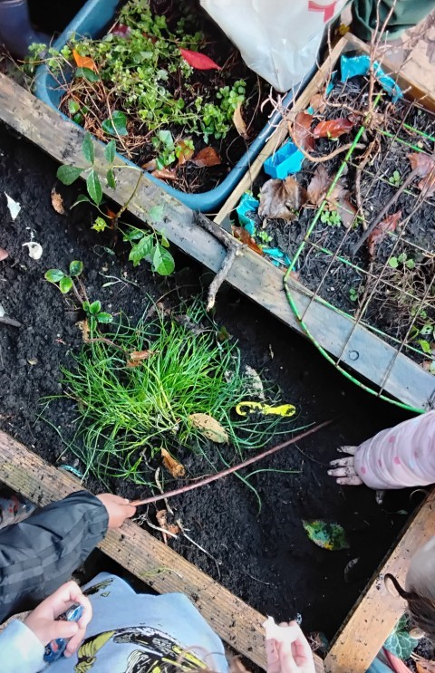 Because the children did such an amazing job with the planting, our garlic bulbs have already shot up and are thriving! You may notice them in the planters in the main garden when you are dropping or collecting your child.