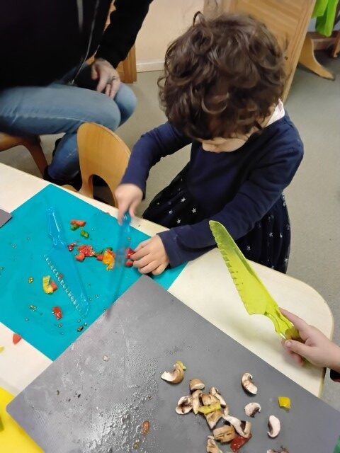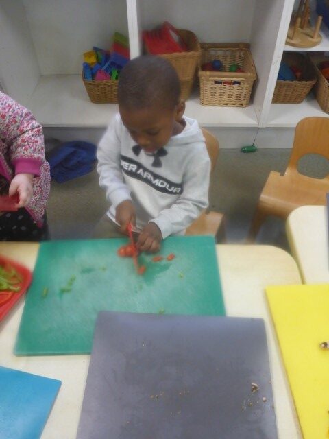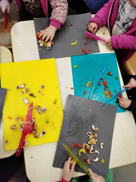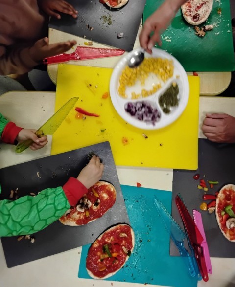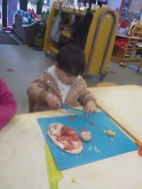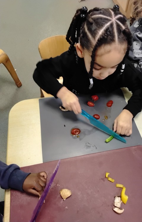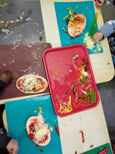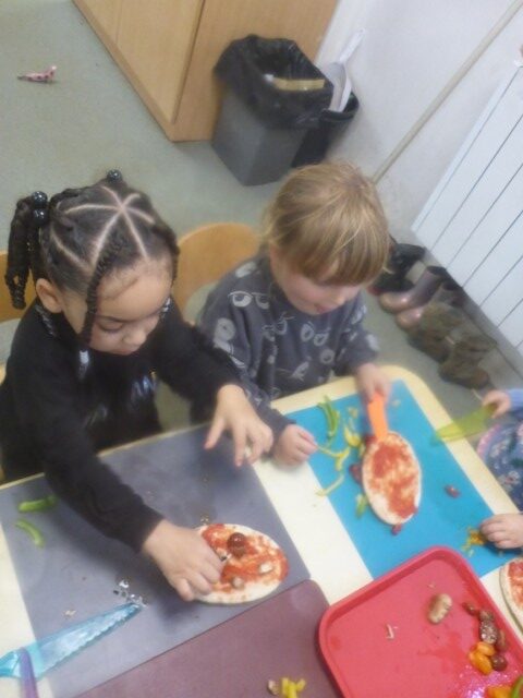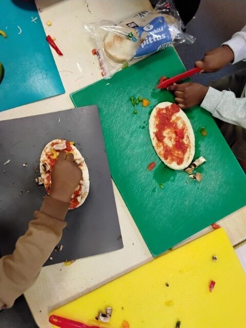 We used safety knifes to chop up yummy vegetables for our pizzas and salad. Each child made their own pizza by spreading tomato sauce, sprinkling cheese, and placing on toppings of their choice. Once they were cooked the children brought home their pizza and salad to share with their families.