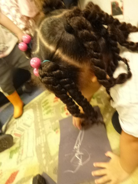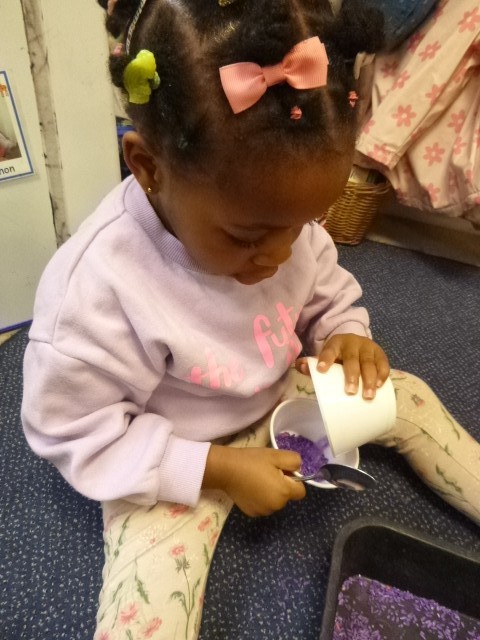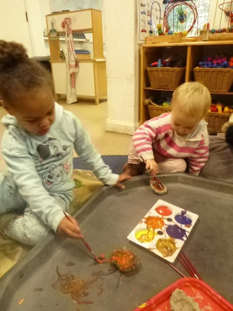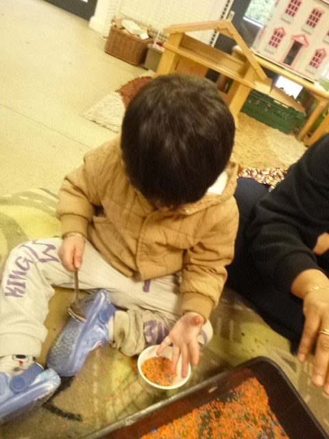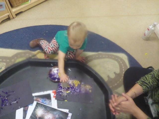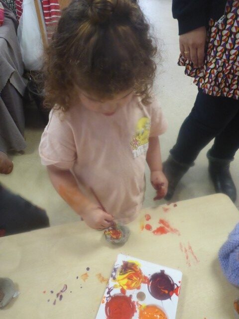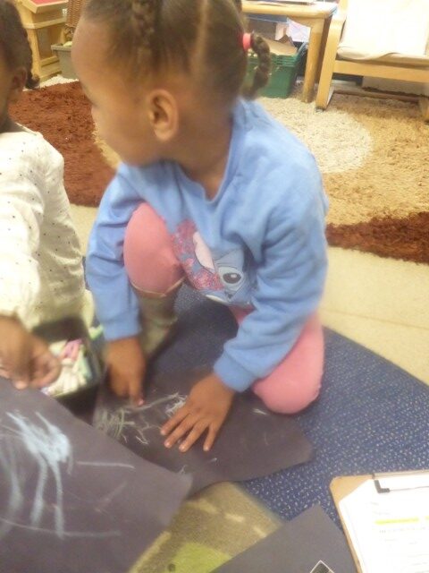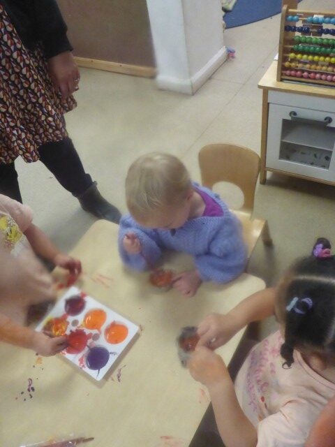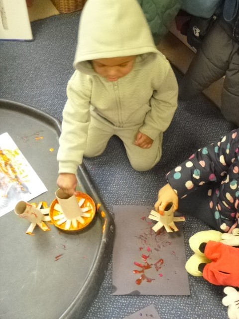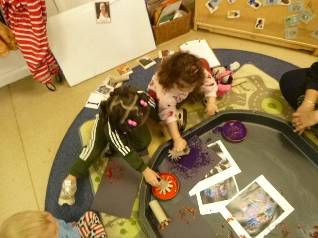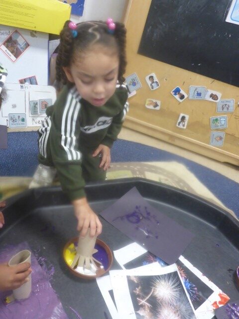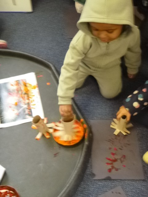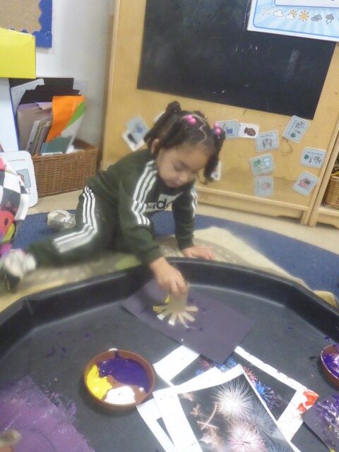 All groups used clay to create Diva pots and then decorated them with paint. We learned about being safe with candles and got the chance to blow them out at group time. We decorated hand templates with different Mendhi designs. We read non-fiction books about fireworks and Diwali. We used paint and chalk to create firework pictures. We used coloured rice and chalk to recreate rangoli patterns, using different shapes, lines, and colours.