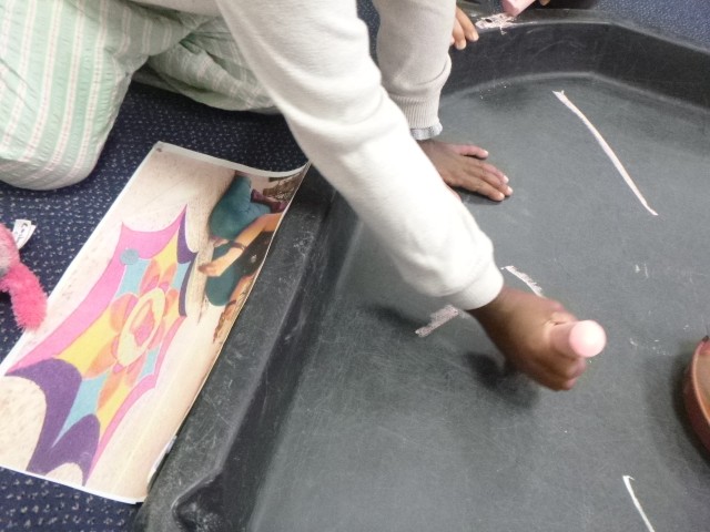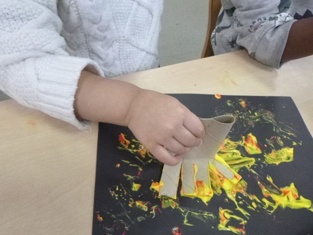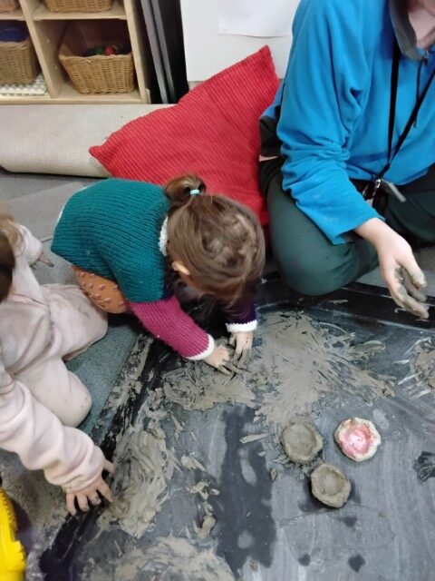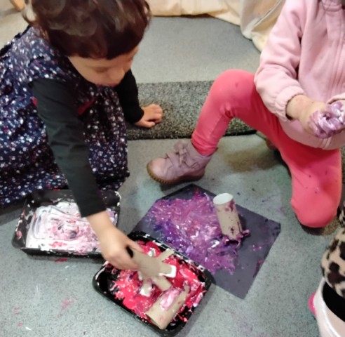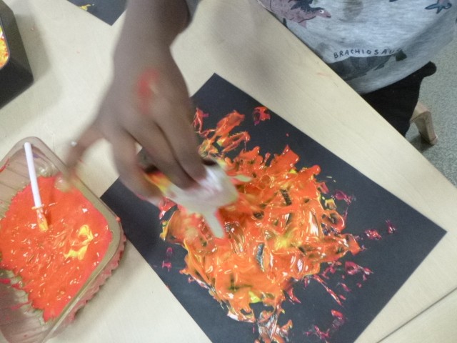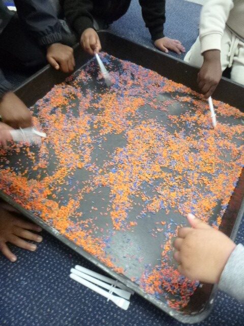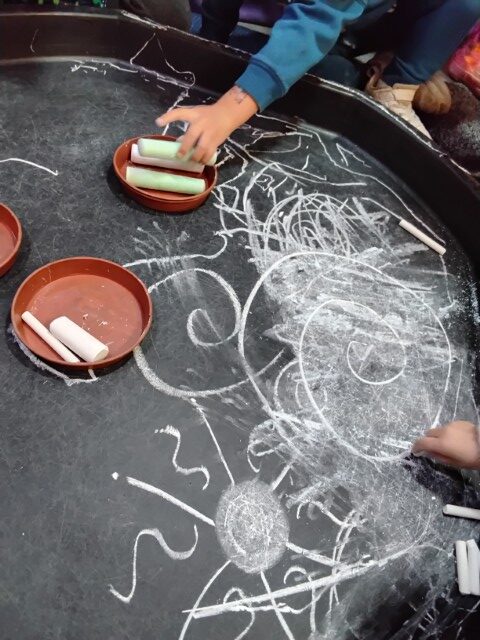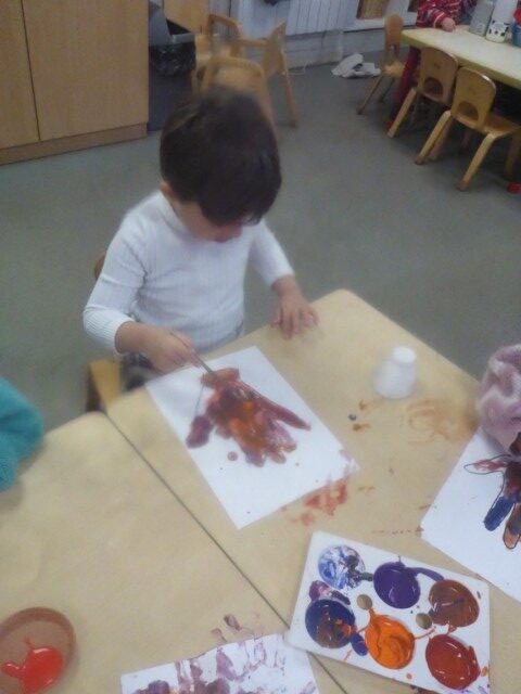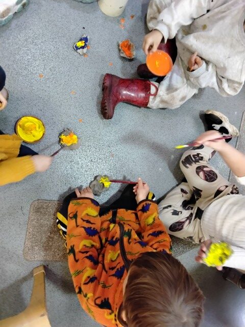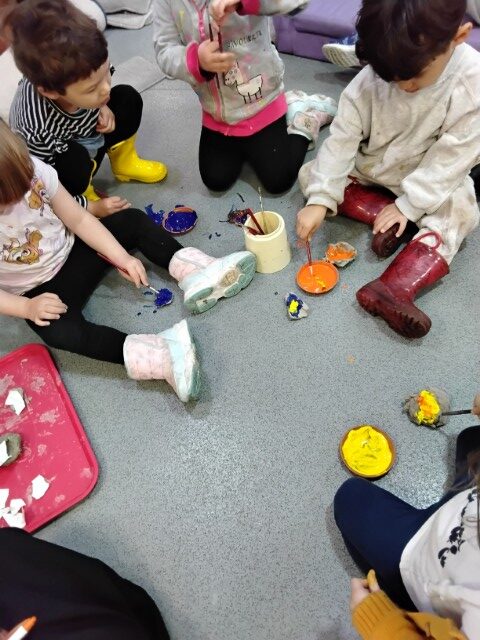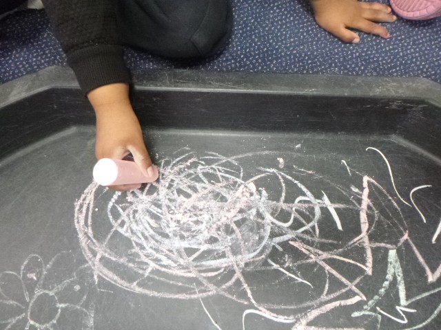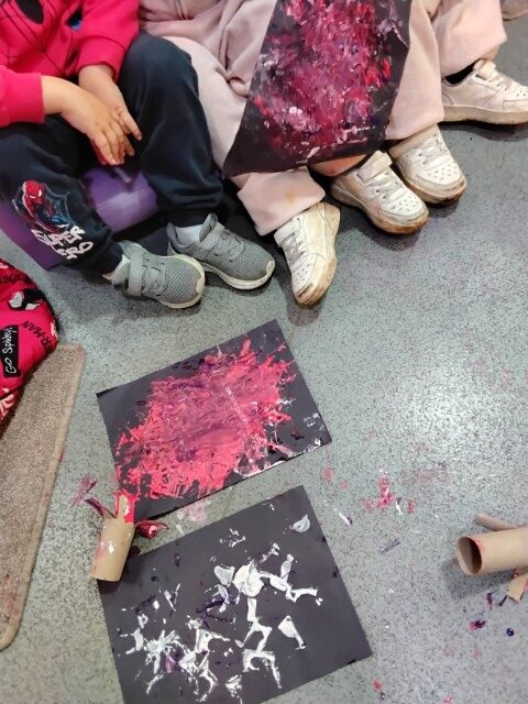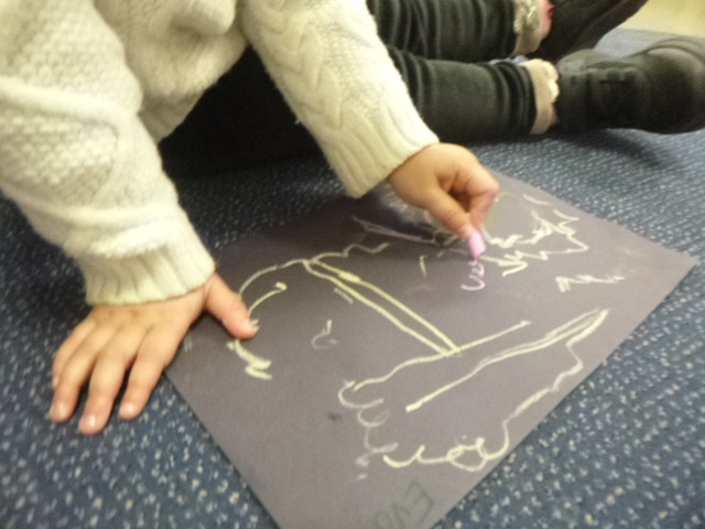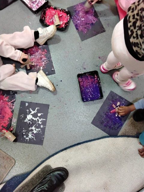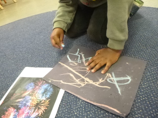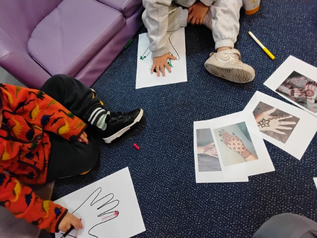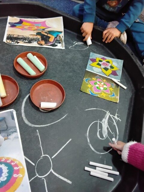 All groups used clay to create Diva pots and then decorated them with paint. We learned about being safe with candles and got the chance to blow them out at group time. We decorated hand templates with different Mendhi designs. We read non-fiction books about fireworks and Diwali. We used paint and chalk to create firework pictures. We used coloured rice and chalk to recreate rangoli patterns, using different shapes, lines, and colours.