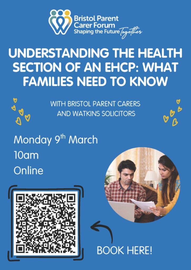On Monday 9th March at 10am, Bristol Parent Carers will be joined by Watkins Solicitors for an online session called “Understanding the Health Section of an EHCP: What Families Need to Know”. This session will help families understand this important part of Education, Health and Care Plans.