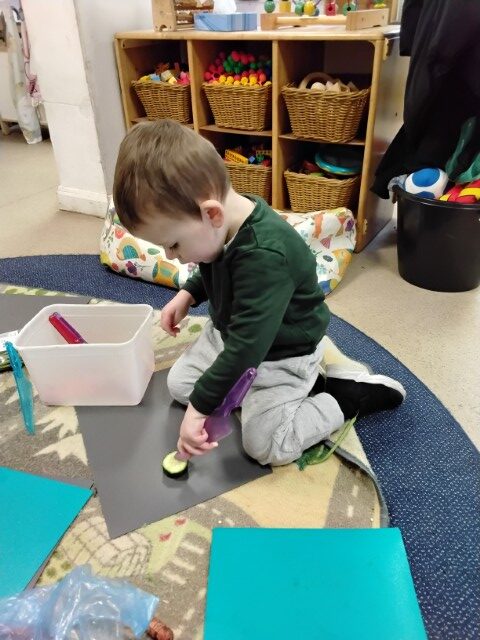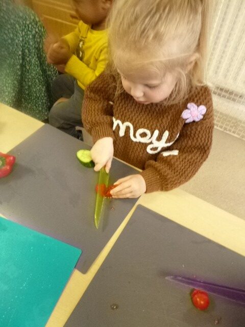 The children have been giving attention to the narrative of this wonderful story whilst learning the names of different fruits. They have been tasting and cutting different fruits, exploring new flavours and textures through hands-on experience.