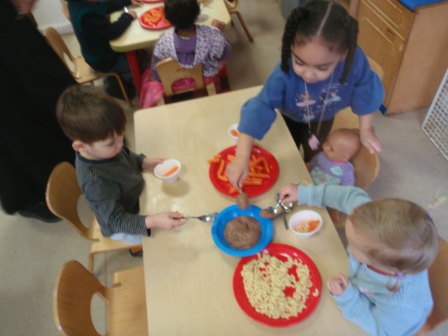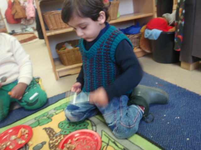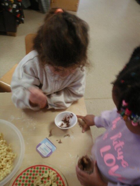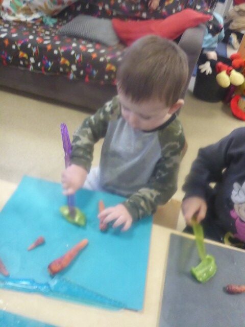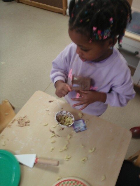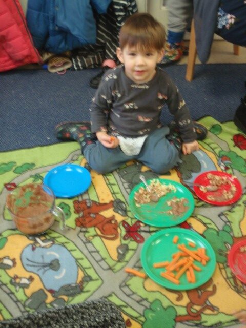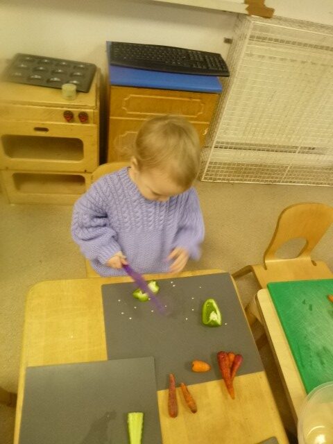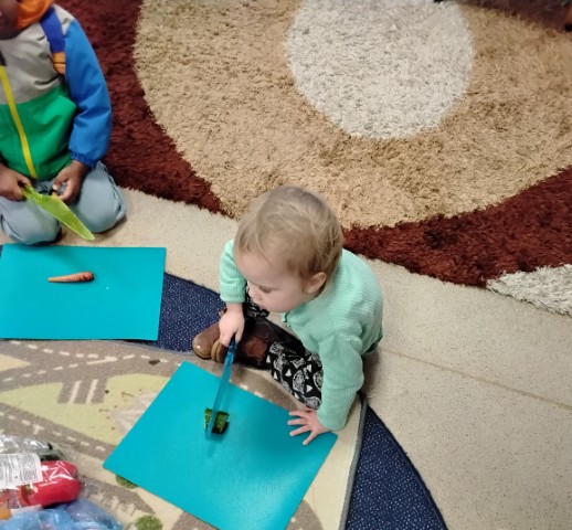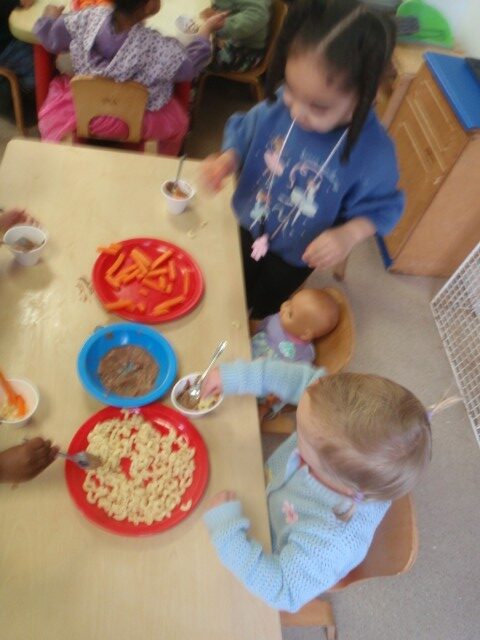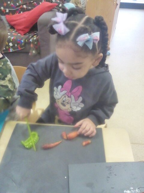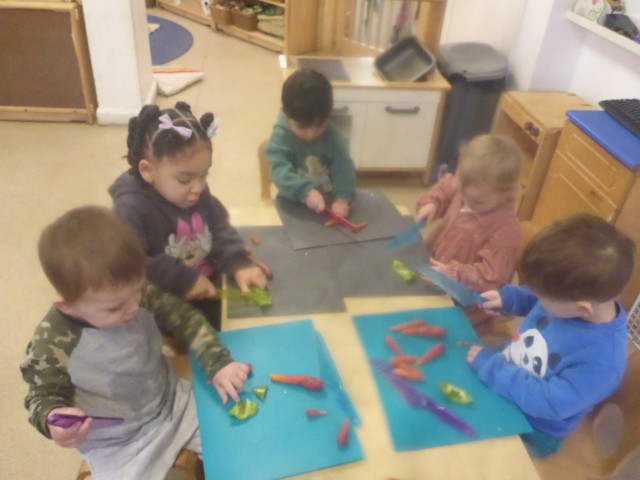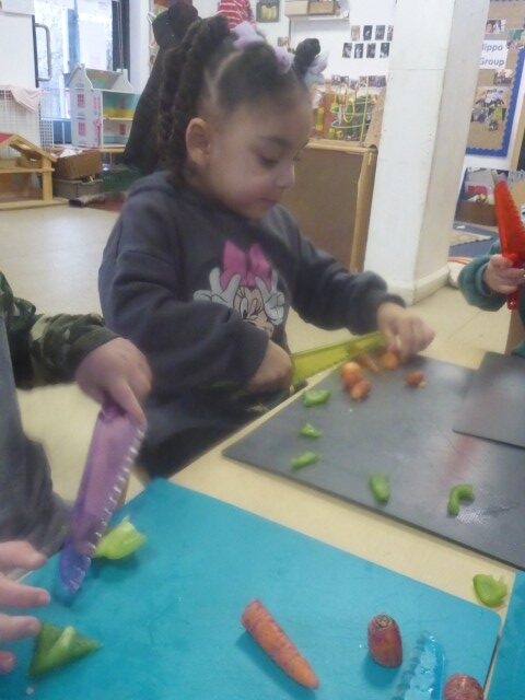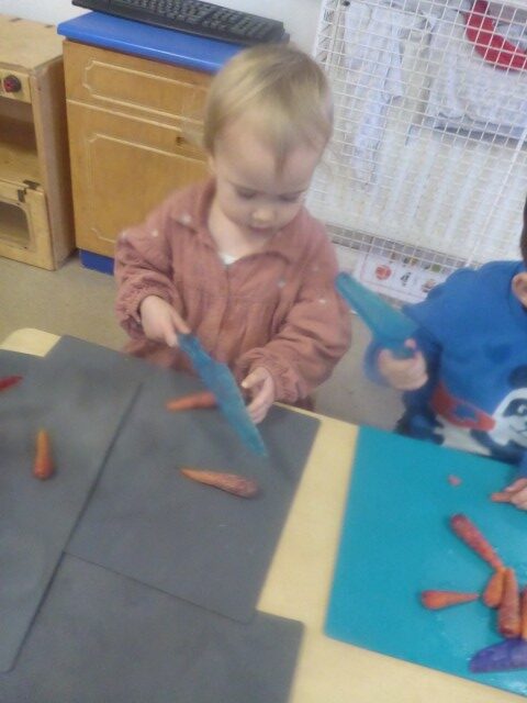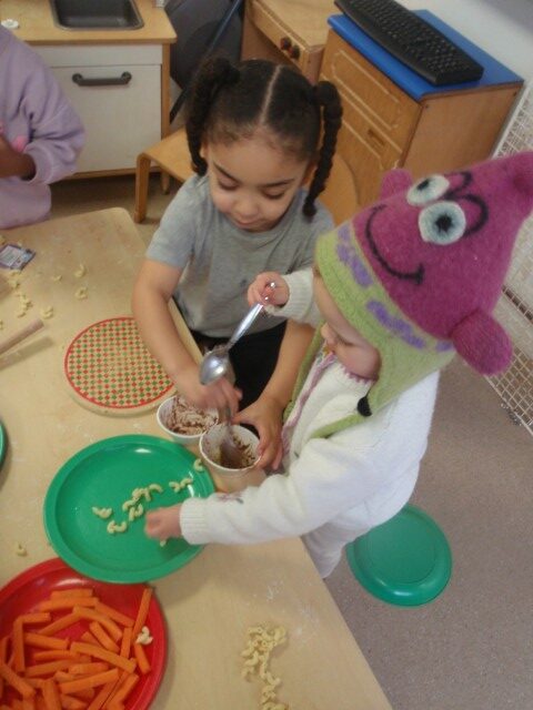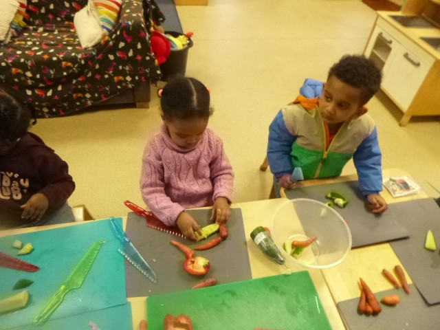 The children have been using safety knives to chop fruits and vegetables, developing fine motor control and safe kitchen skills. They have been exploring the foods like carrots, chocolate mousse, and macaroni to compare texture, taste, and smell, building sensory awareness and descriptive vocabulary.