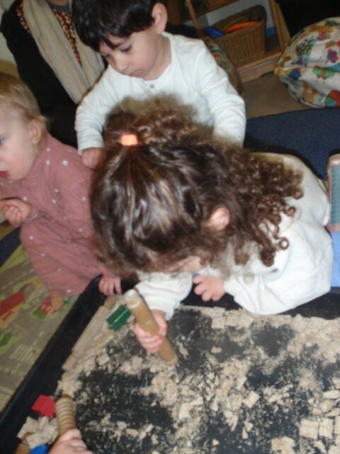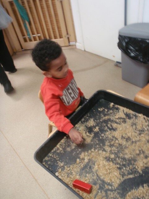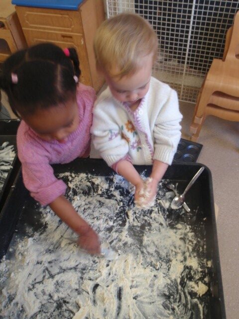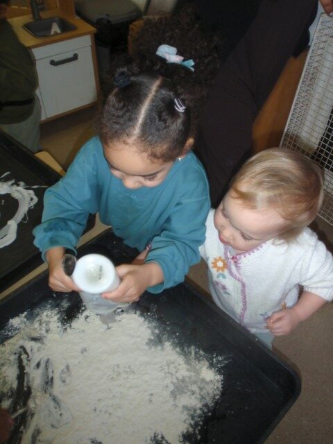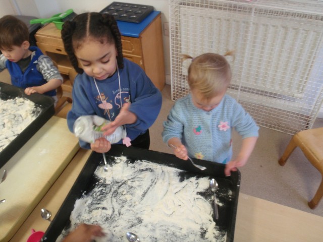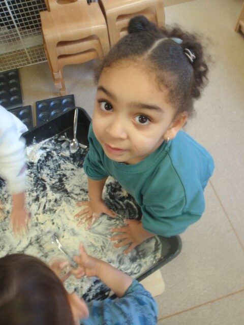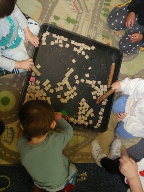We have been exploring cereals including cornflakes, shredded wheat, and Weetabix using our hands, bricks, and rolling pins to explore how to smash, crunch, and sprinkle whilst discovering different textures. The children have been mixing flour and hair conditioner to make playdough, noticing changes to the mixture and working our hand muscles to knead the dough, developing both scientific observation and physical strength.