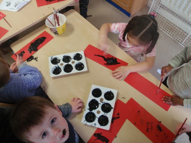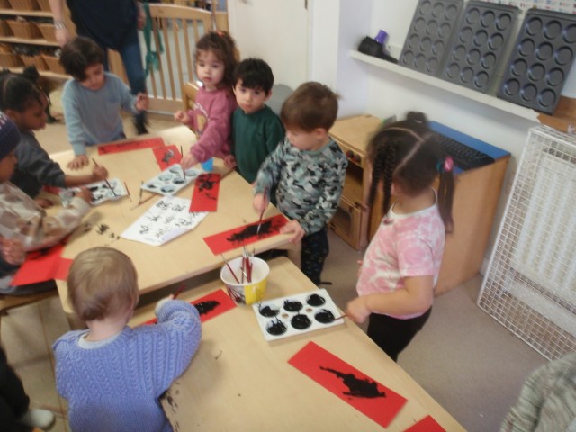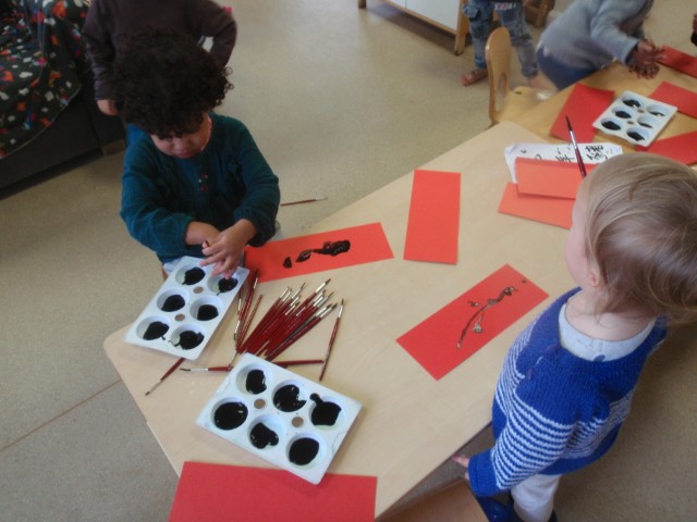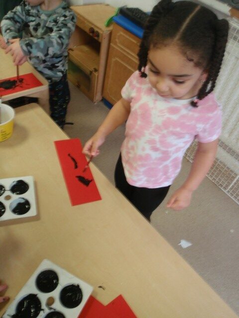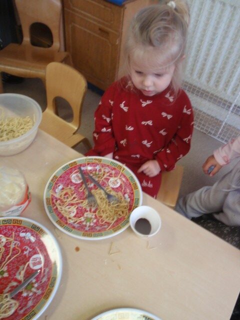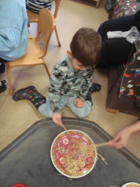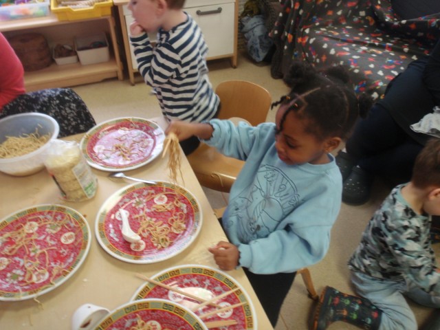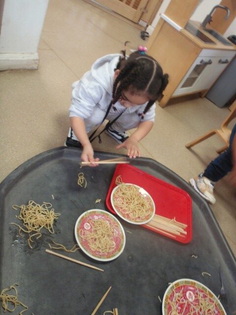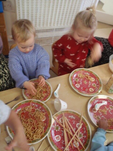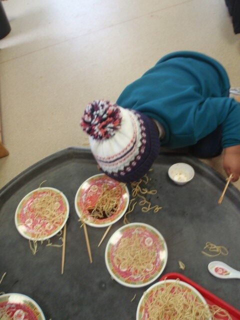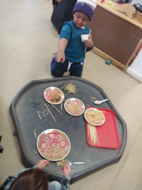 The children have been using black paint to make marks on red card as inspired by Chinese writing and symbols, exploring mark-making in a new cultural context. They have been exploring the taste and texture of noodles, feeling the differences between cooked and dry noodles, tasting how the sauce changes their flavour, and using our fine motor skills to use chopsticks and tweezers to eat them.