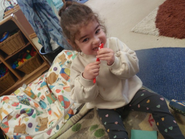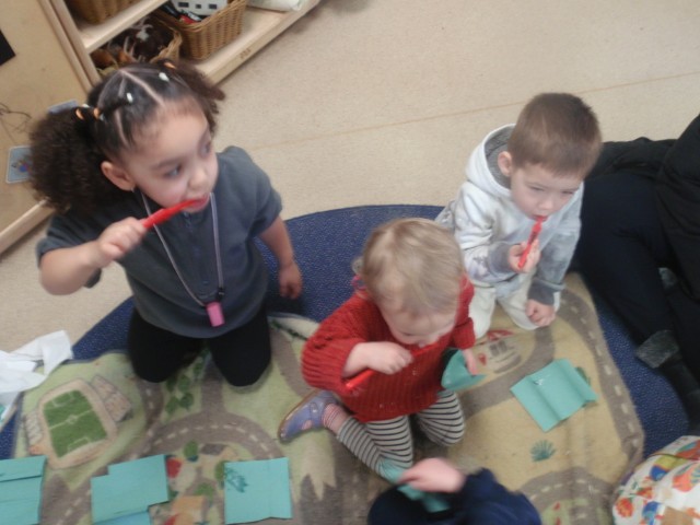 Story time has been just as engaging, with the Three Little Pigs capturing the children’s attention beautifully. The children have been giving their focus to a longer narrative and beginning to join in with repeated refrains, and “huff puff” has been heard a lot around the room! Dentist themed books have also been a lovely link to the people who help us topic, with the children concentrating on the key words “brush” and “clean” as a fun reminder of how to look after their teeth. Counting songs including Five Little Men and Five Little Ducks have rounded things off brilliantly, with children using objects and their fingers to count up to five.